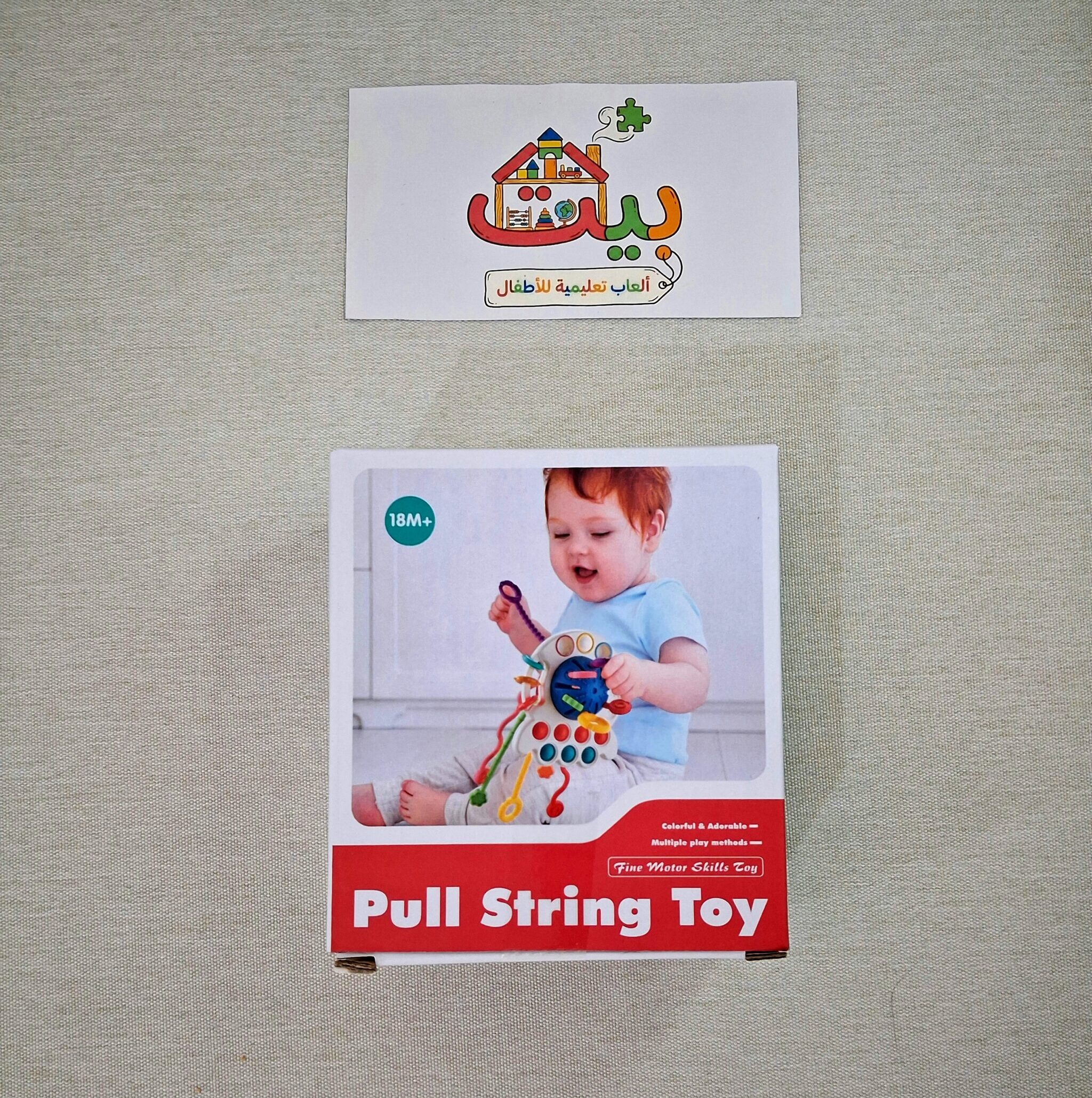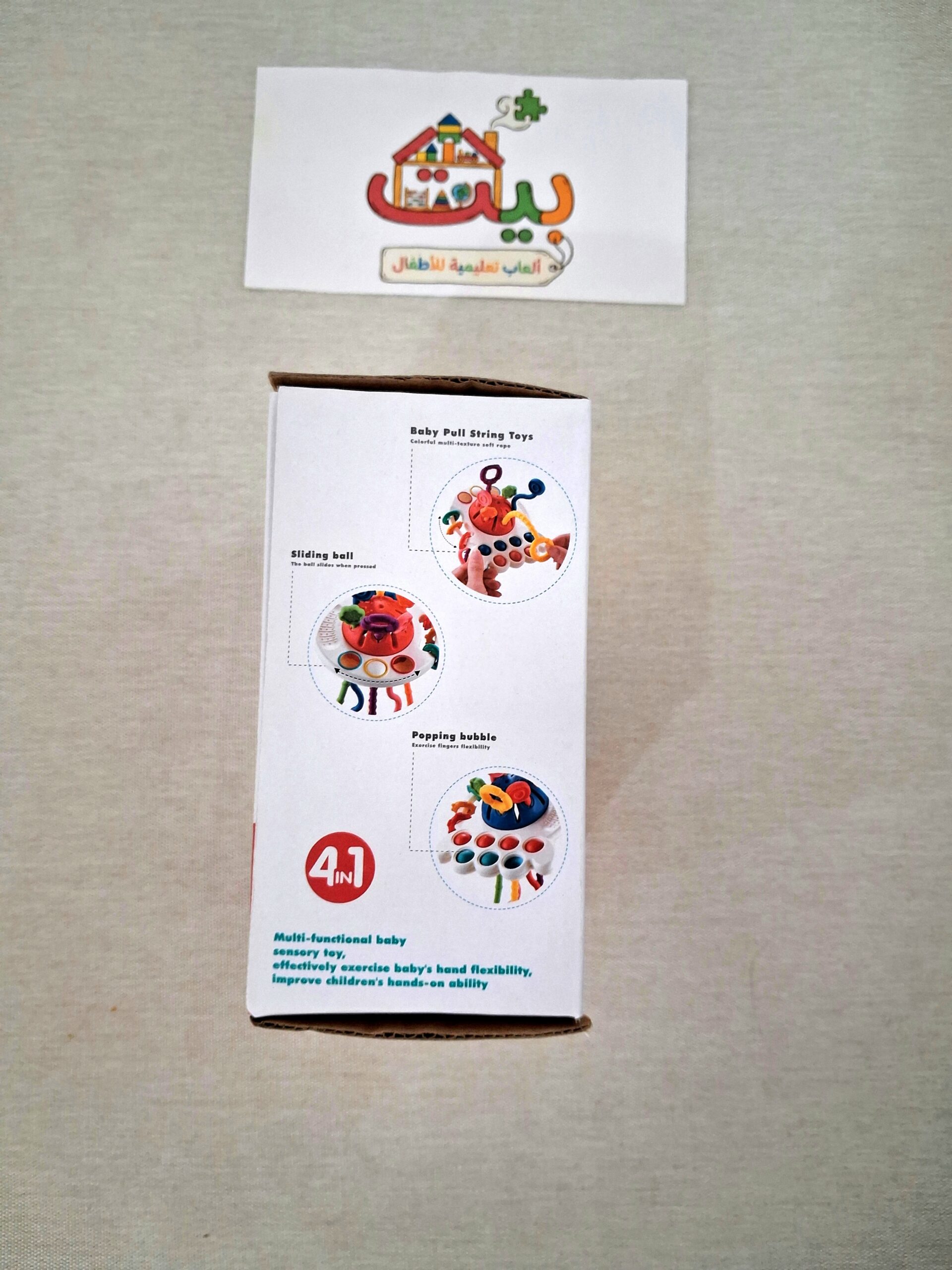 لعبة حسية متعددة الأنشطة خاصة بالرضع النشاط الرئيسي هو سحب الخيوط، خيوط عالية الجودة مصنوعة من مواد آمنة وكل خيط له لون وملمس مختلف يحاول الطفل سحبها وبالتالي يعزز التنسيق البصري الحركي وكذلك يقوي عضلات اليد والأصابع ويختبر ملمس مختلف في كل مرة، النشاط الثاني يحاول الطفل إدخال وإخراج الفقاعات لدينا أيضا جزء حسي مختلف الملمس وكذلك خشخيشات وأخيرا نشاط الكرة المنزلقة يحاول الطفل تحريك الكرة من منفذ لآخر