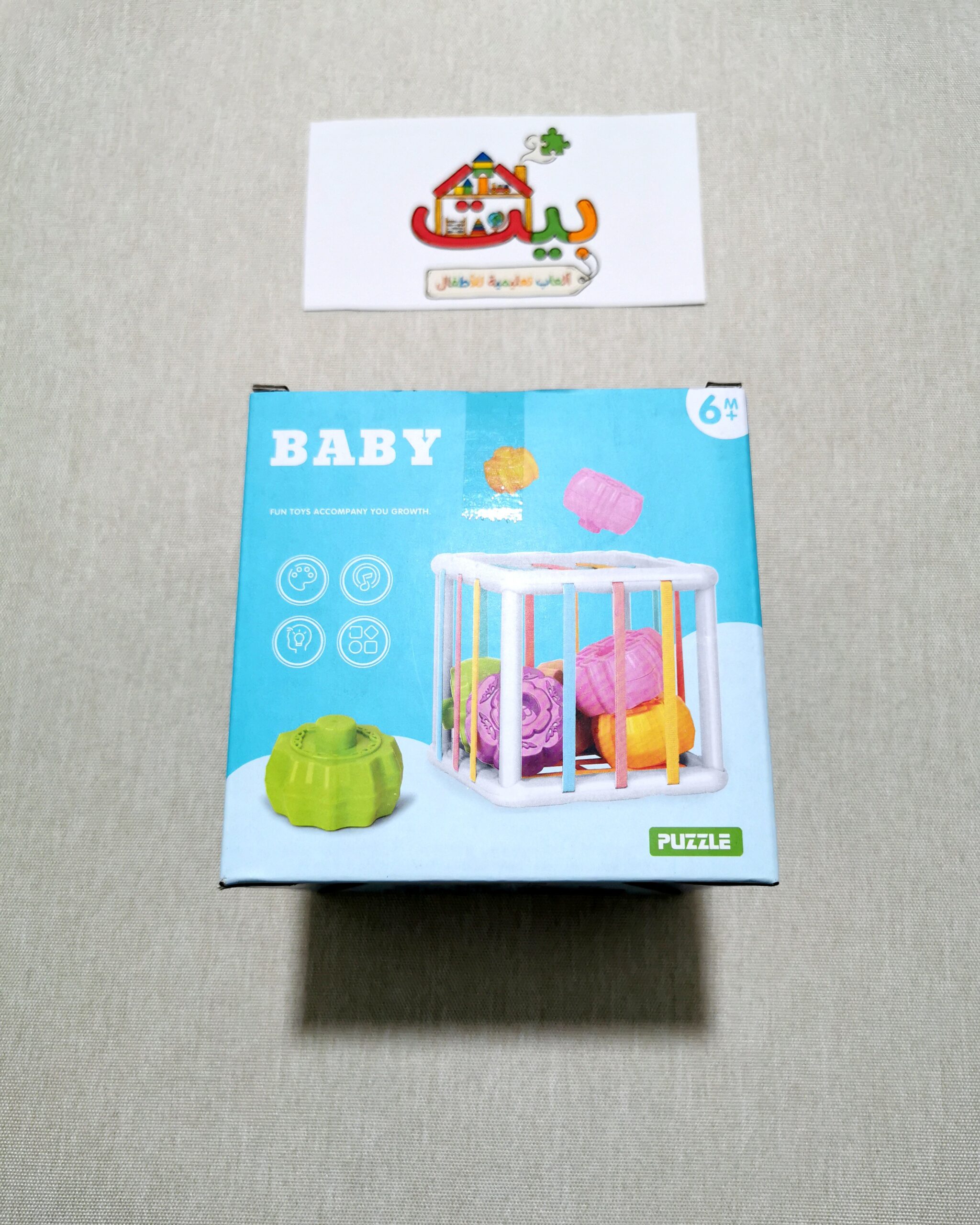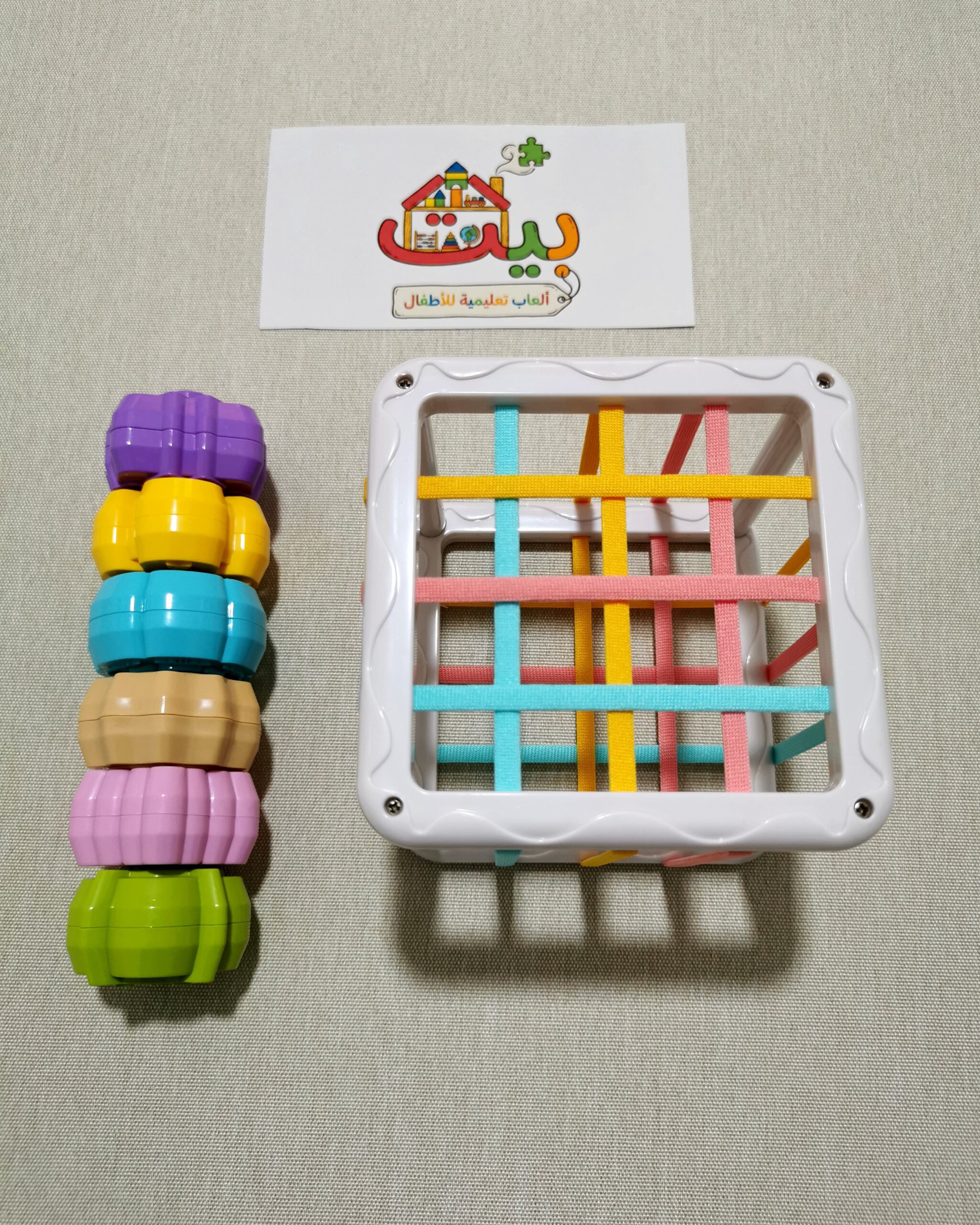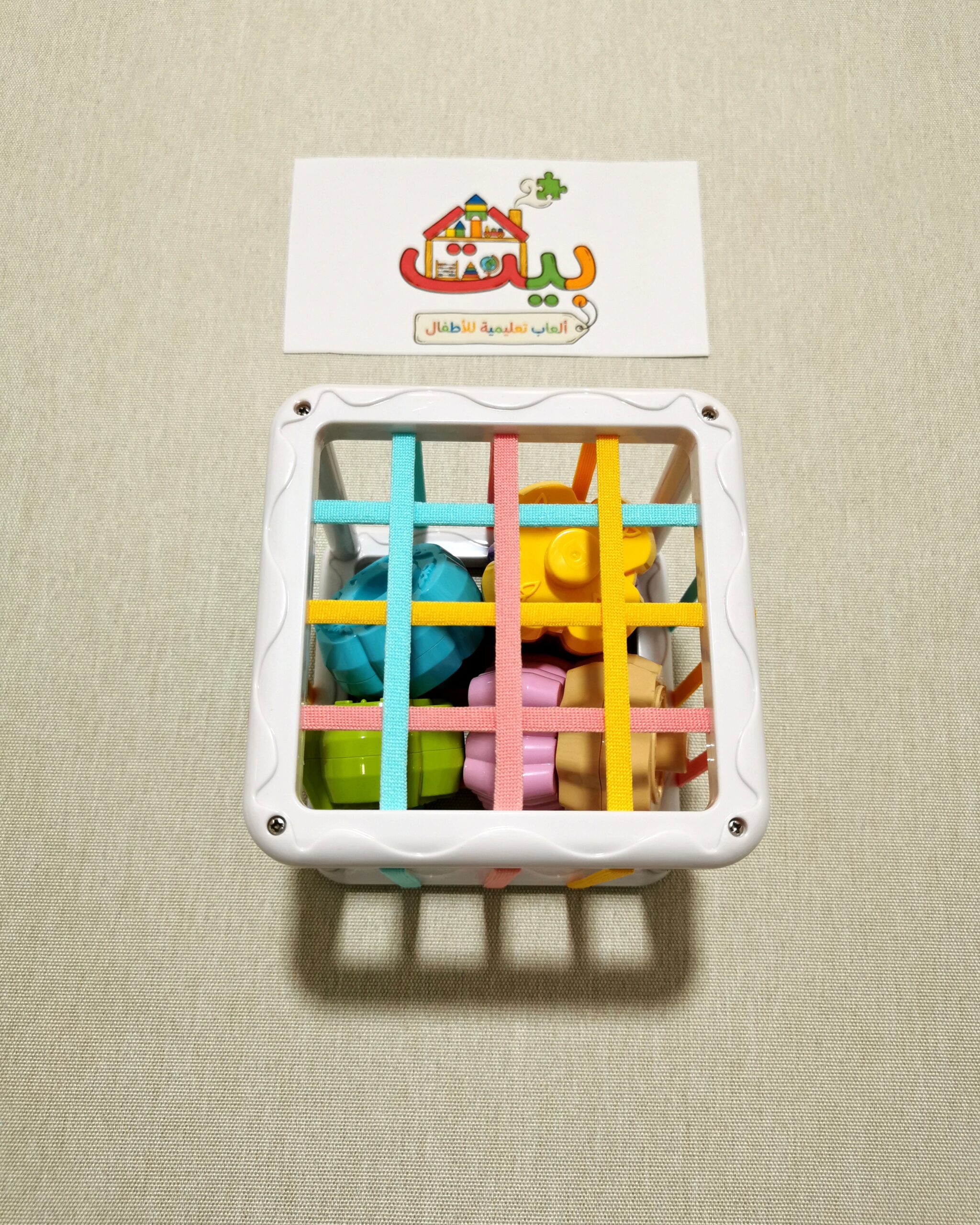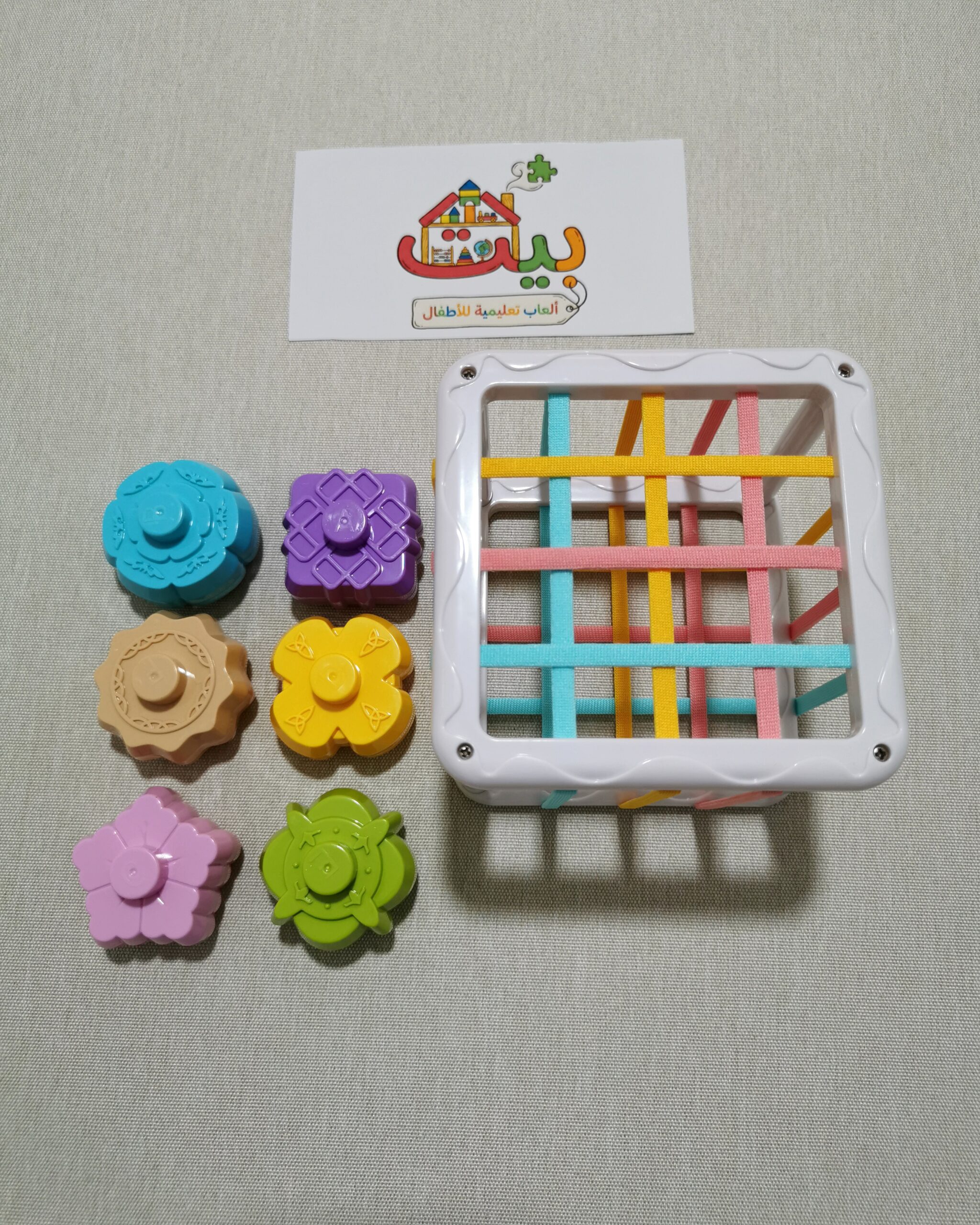 مكعب مصمم ليساعد أطفالنا على تطوير حركة اليد والتناسق بين العين واليد من خلال ادخال وإخراج القطع عبر شبكة الأشرطة المطاطية